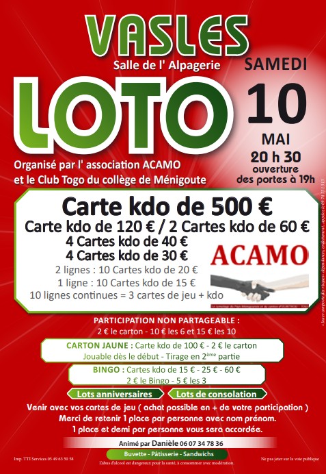 Venez nombreux à notre soirée Loto animée par Danièle pour le bénéfice du club Togo des élèves du collège de Ménigoute.